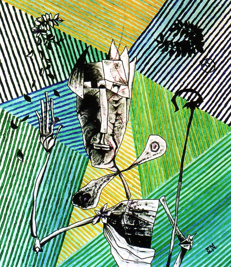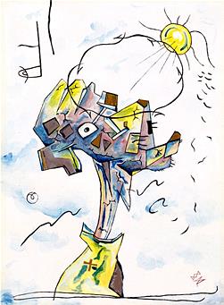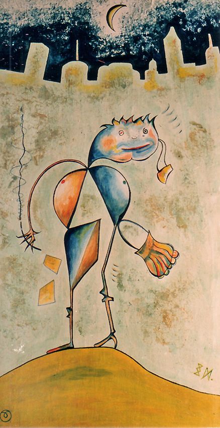 | Der blinde Stier, 1992, Öl und Pastell / Pappe, 93 cm x 69 cm, (Privatbesitz) | Der Kaffeegott Braunel Bonolus, 1991, Öl / Pappe, 42 cm x 29 cm, (Besitz unbekannt, verschollen!) |
