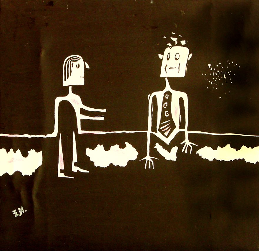 | Antwort eines faulen Schülers, Der fordernde Leherer: Könnten Sie mir mal helfen ? Laßt mich in Ruhe !, 1992, Öl / Lw, 38 cm x 38 cm, | Antwort eines faulen Schülers, Die fordernde Lehrerin: Kannst Du mir mal helfen ? Rutscht mir den Buckel runter !, 1992, Öl / Lw, 38 cm x 38 cm | Antwort eines faulen Schülers, Der Mitschüler: Helfe mal bitte. Leck mich am Arsch, 1992, Öl / Lw, 38 cm x 38 cm |